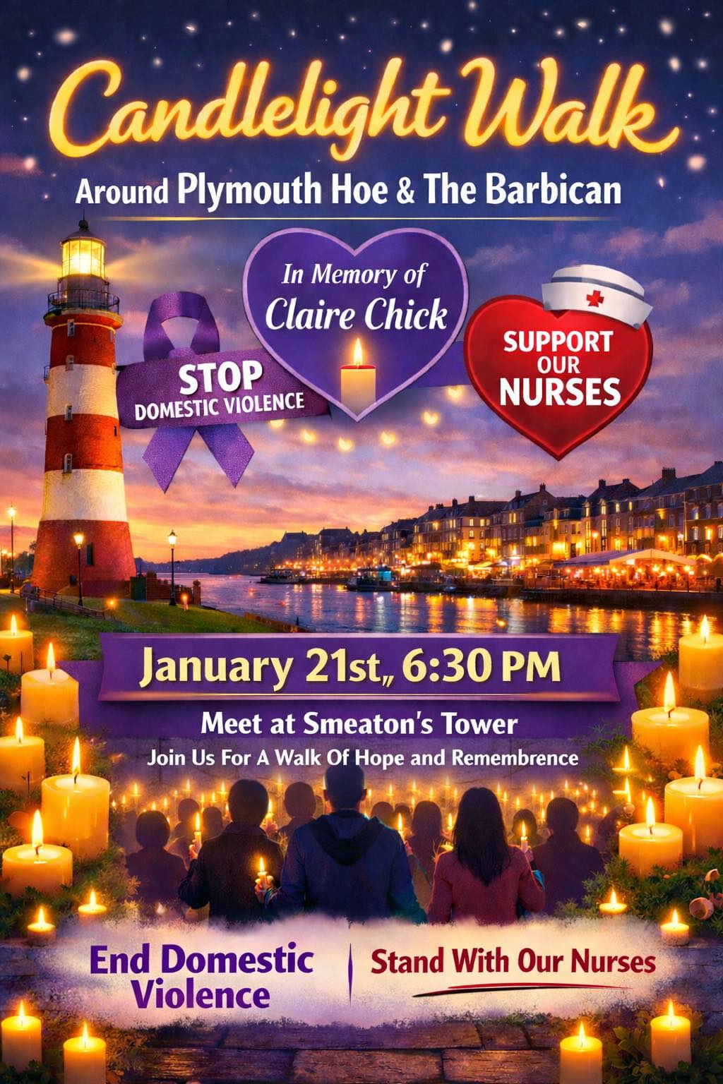 A candlelit vigil walk will take place in Plymouth this evening as people across the city come together to remember nurse and lecturer Claire Chick.