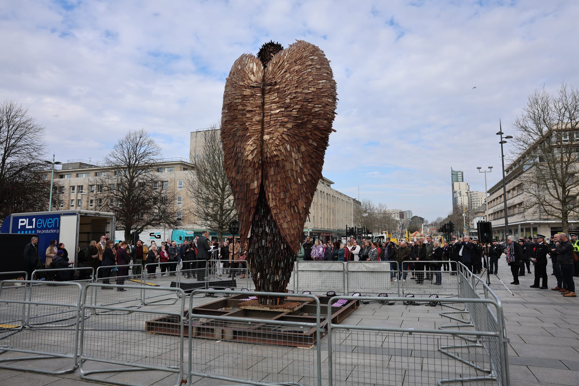 Hundreds of people gathered in Plymouth city centre this afternoon as the Knife Angel was officially unveiled.