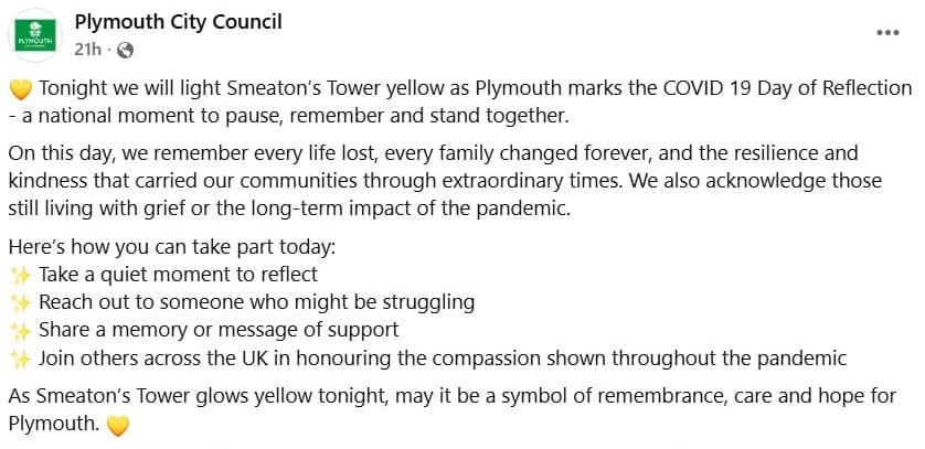 Plymouth City Council has apologised after Smeaton’s Tower was left glowing the wrong colour on the COVID-19 Day of Reflection.